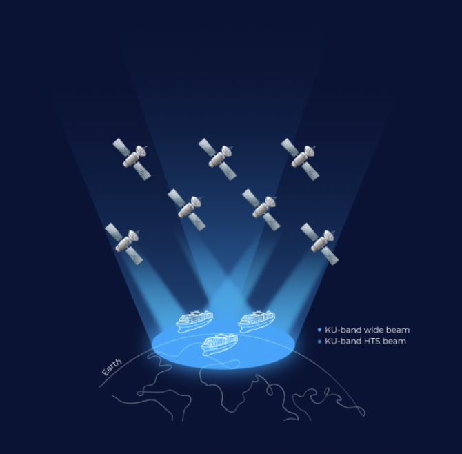 Vessels can view multiple HTS and wide beam satellites, ensuring maximum availability of broadband service.